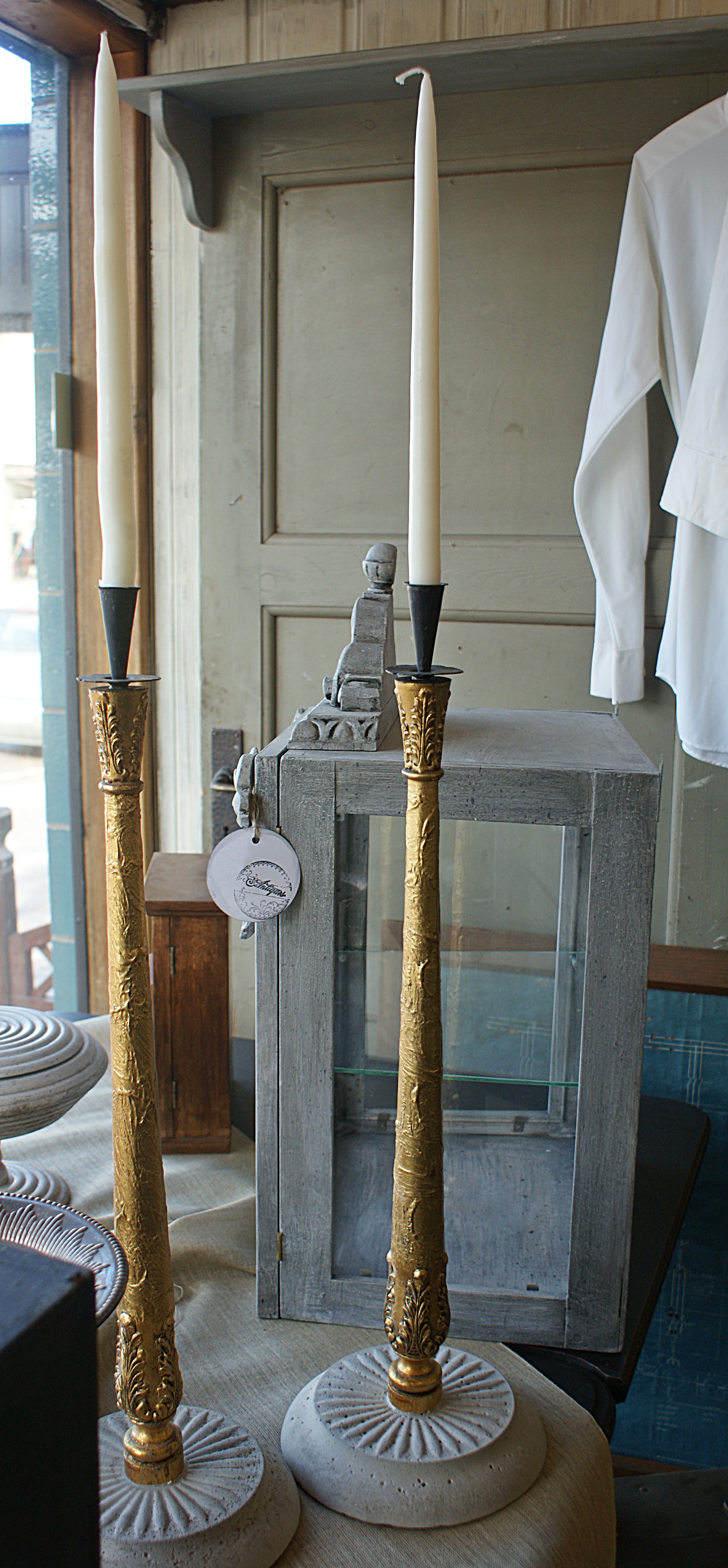 såldSONY DSCLjusstakar är en passion vi båda delar. Så det finns en hel del här i butiken. Många av dom har vi själva gjort. De senaste paret är en sammansättning av betong, guldpelare samt smidesljushållare. De är så maffiga och unika.