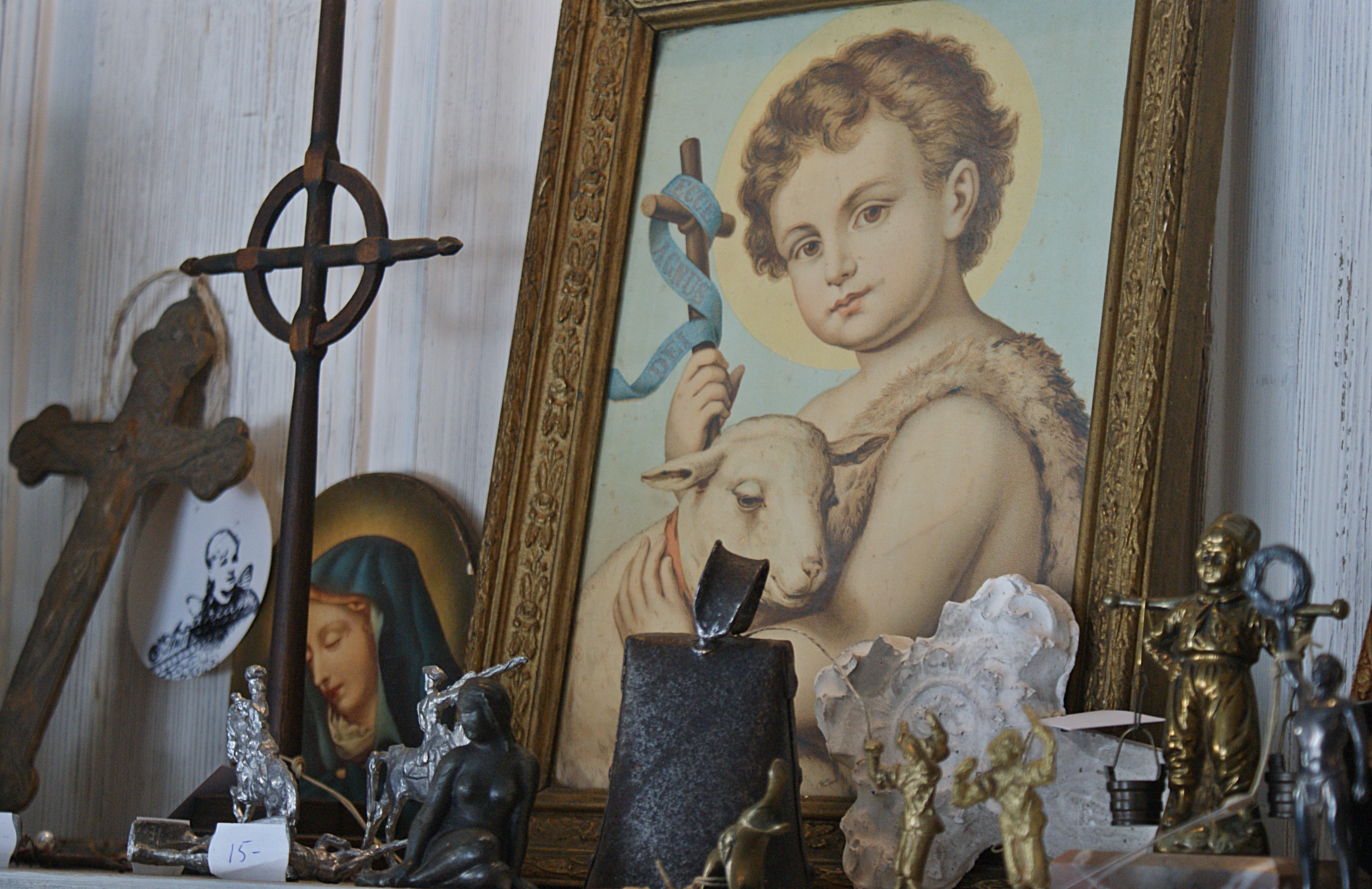 Jag tror på det goda…jag tycker om det positiva i symboler. Precis som jag tycker om konsthantverk som någon har gjort med glädje och känsla. Här på andra handen samlas kors, madonnor och Jesusbarn tillsammans med tennsoldater fula gubbar och fräcka flickor….