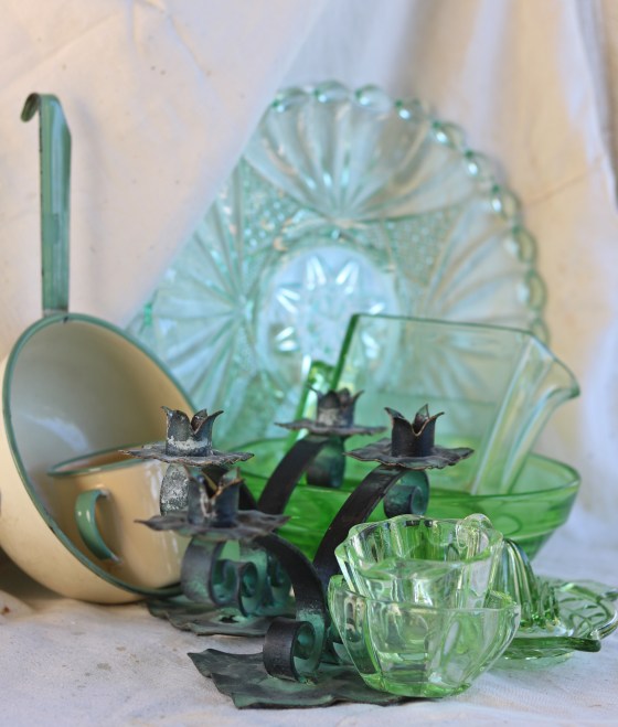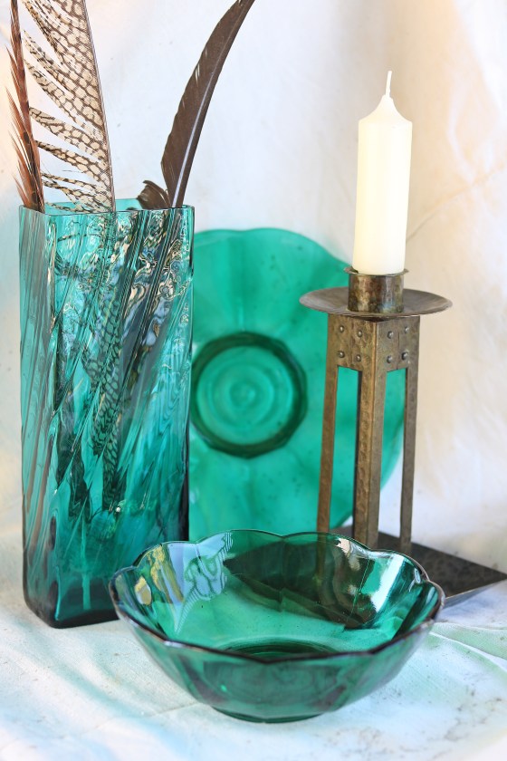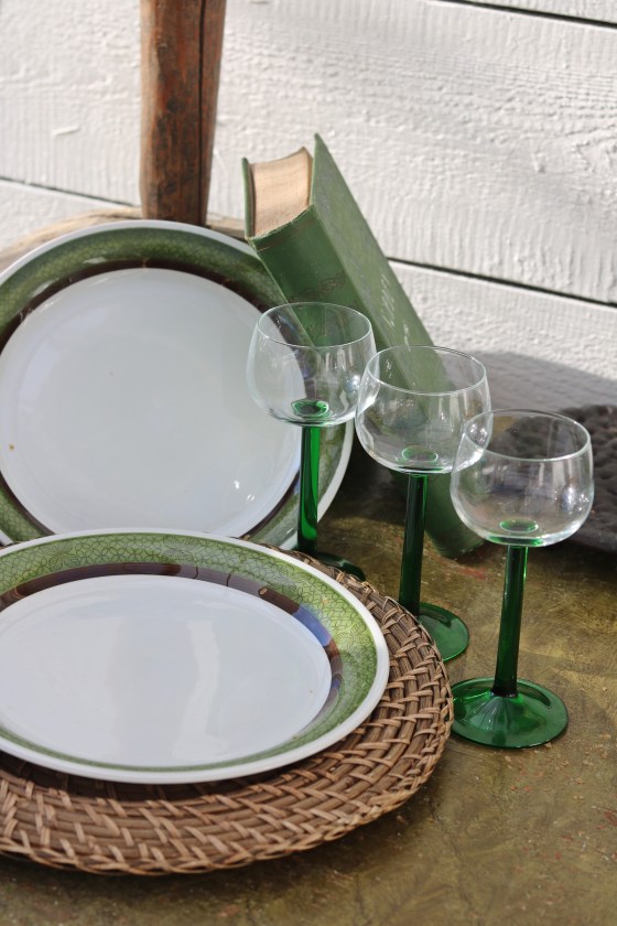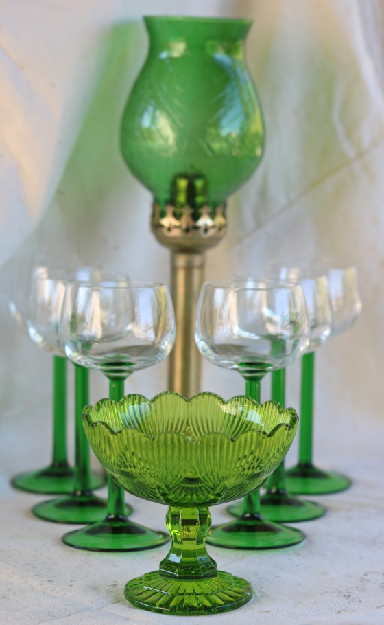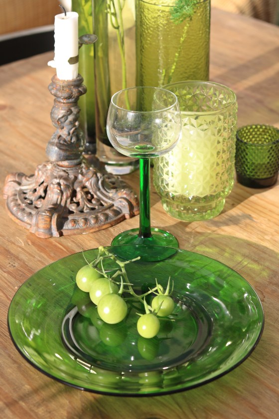 Glastallrikar i grönt samt glas.