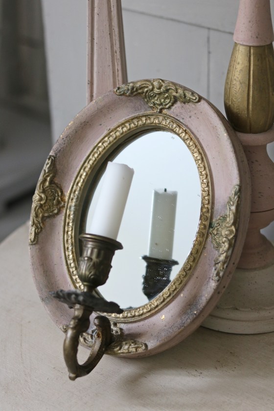 Lampa, Ljusstake, Spegellampett samt bord . Bordet är ett litet slagbord med två klaffar.